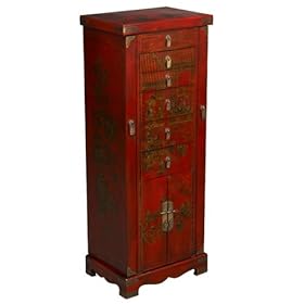 he epitome of innovative Eastern craftsmanship, this handcrafted jewelry armoire artfully combines the rich heritage of traditional Chinese design with a uniquely functional jewelry storage solution. Created by expert artisans in China's Guangdong province, this wonderful piece features a sturdy wooden frame ensconced in opulent red leather. The front showcases hand-painted vignettes of traditional Chinese life featuring many children playing, rendered in deep hues of gold, green, red and black, while the sides show magnificent peonies in bloom. In Chinese tradition, peonies symbolize modesty and marital happiness. The deftly lined interior offers a remarkable array of storage options. Six drawers in graduated sizes pull open, allowing you to tuck away smaller personal treasures such as earrings and bracelets. Below, double doors open to reveal ample cabinet space for larger items. Flanking the drawers are unique hinged panels with rows of hooks, perfect for hanging anything from keys to necklaces. The lid also swings open to display a mirror framed by delicately painted blossoms to complement the exterior motifs. Finishing this masterpiece are drawer pulls and finely scrolled corner braces in antiqued iron. A superior work in which art meets practical design, this stunning jewelry armoire is sure to become a treasured family heirloom. Measures 51 inches high x 20 inches wide x 14 inches long. AsiaEXP brings you authentic, handmade goods from a variety of world cultures. With this purchase, you are not only receiving a gorgeous handicraft, you are also supporting a great cause. By shopping with us, you help to sustain the talented individuals making these fine products and preserve the rich cultural heritage of East Asia. The handcrafted nature of this product will cause minor differences in design, color and sizing. Subtle variations will occur from piece to piece, adding to the unique quality of individual creations. Measurements may vary slightly